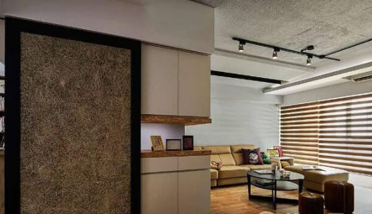 进门后,以机能性划分左右两条动线,分别通往客厅与餐厅,端景的钻泥板门片具有调节湿度的功能,更能提升居宅的舒适度。