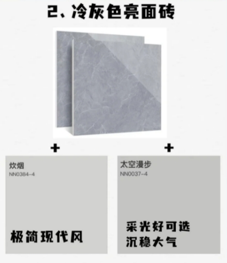 2、冷灰色亮面砖:+炊烟极简现代风;+太空漫步适合采光佳的楼层高级大气