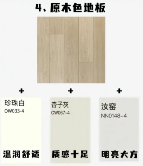 4、原木色地板:+珍珠白温润舒适;+杏子灰质感一足;+汝窑明亮大方
