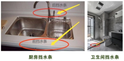 条形装置的高度和地面以及台面形成一定高度,以防止厨房台面的积水漫流到地面,卫生间淋浴区的积水漫出到干区,达到干湿分离的目的。