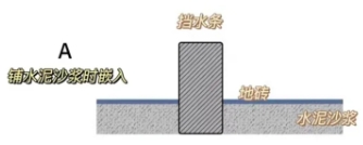挡水条跟地面成一体式。在预埋挡水条和瓷砖铺设之前先在地面做出高度50MM,宽度30MM的止水带,然后在大理石的挡水条内部浇灌水泥砂浆,直接往止水带上扣住即可。
