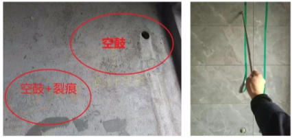 有的还可以直接通过肉眼来观察,如果空鼓了,这个部位要比其他的稍微高一些,同时表面可能还会有裂缝。但是,如果用手按下去,发现里面其是空的。