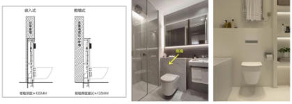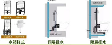 ■隔层排水:也就是非下沉式卫生间,排污管道在楼下天花板,排污管位置已固定,需通过移位器改墙排水,那马桶和排污管一定要在同一面墙上,不能拐弯。
