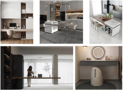 悬浮式柜体下方留空可以有更方便的使用功能,比如收纳柜下方放置扫地机器人;玄关柜下方收纳常穿的鞋子:浴室柜下方留空避免水汽入侵等,功能性与实用性兼备。